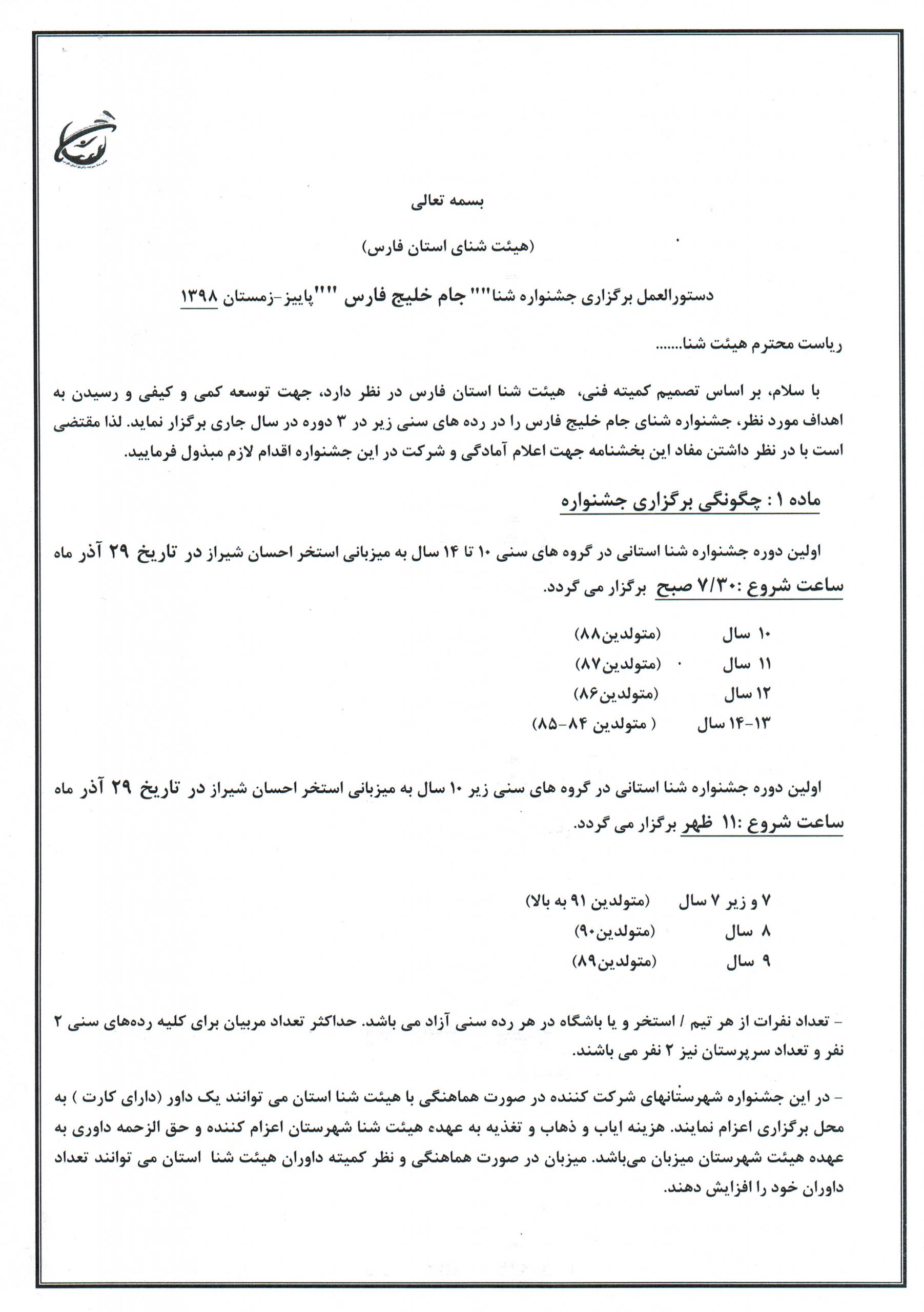 ذیلا” آئین نامه برگزاری جشنواره شنا” جام خلیج فارس ” شیراز – ویژه آقایان جهت اطلاع ارسال میگردد