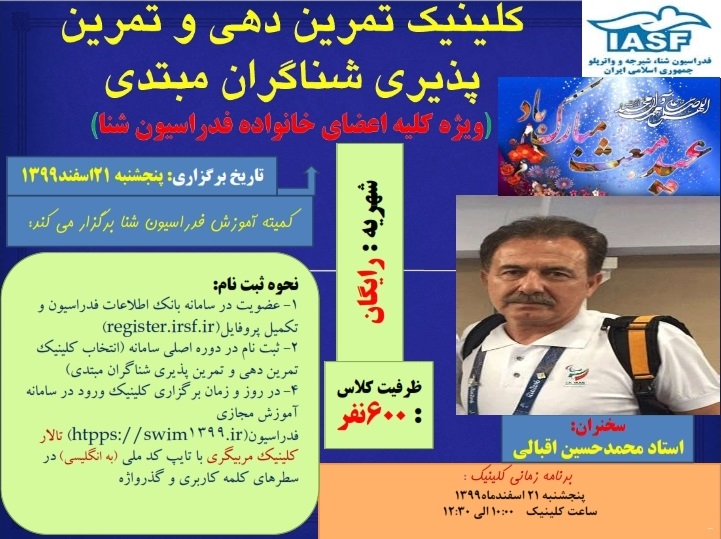کمیته آموزش فدراسیون در نظر دارد به مناسبت عید سعید مبعث کلینیک تمریندهی و تمرینپذیری شناگران مبتدی به صورت رایگان روز ۲۱ اسفندماه ۱۳۹۹به مدرسی محمد حسین اقبالی برگزار کند.