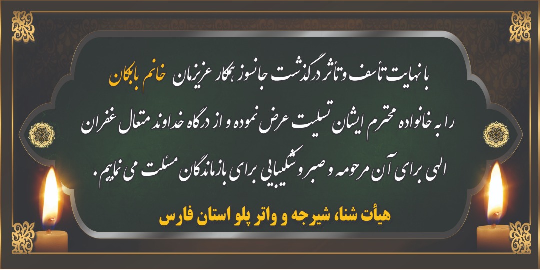 انالله و انا الیه راجعون با نهایت تاسف و تاثر درگذشت جانسوز همکارعزیزمان سرکار خانم بابکان را به خانواده محترم ایشان و جامعه ورزش فارس تسلیت عرض نموده و از درگاه خداوند متعال غفران الهی برای آن مرحومه و صبر و شکیبایی برای بازماندگان مسئلت می نمایی..